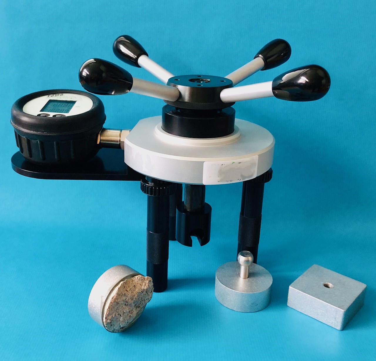 Le testeur d'adhérence sur tripode, ou testeur d'arrachement, est un dynamomètre de traction qui permet de mesurer l’adhérence de toutes pièces ou revêtements collés, vissés ou soudés. Il permet également de tester l’arrachement des vis et des clous. La force est appliquée avec un accroissement constant grâce à la transmission hydraulique du mouvement axial, ce qui assure une mise en oeuvre simple et rapide. Le compte-tour est à manivelle ou à volant 4 bras. La lecture se fait sur manomètre à aiguilles ou digital.